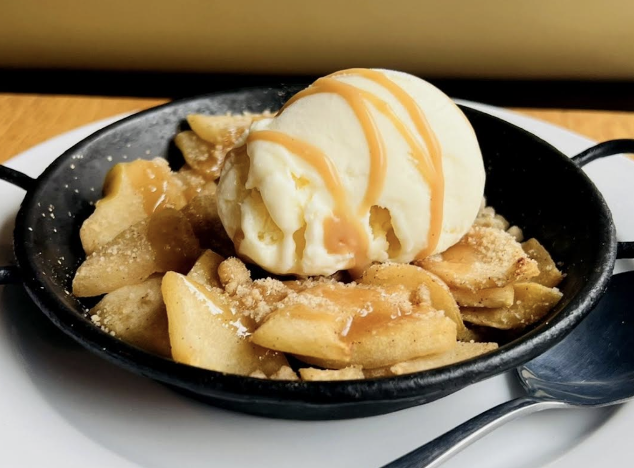 fired baked w/ spice crumble, caramel sauce & vanilla gelato